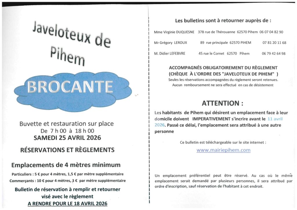 Samedi 25 avril Brocante organisée par les Javeloteux de Pihem